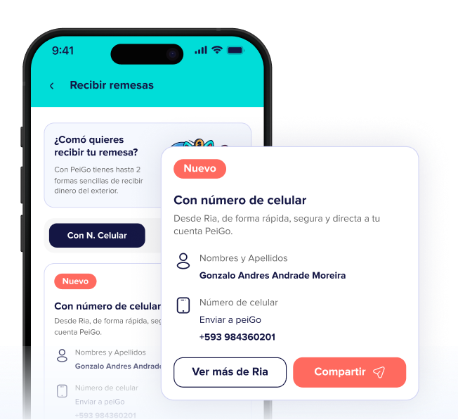 Si te envían por Ria, solo necesitan tu número de celular registrado en peiGo. El dinero llega directo a tu cuenta, sin códigos, sin papeleo y sin esperas.