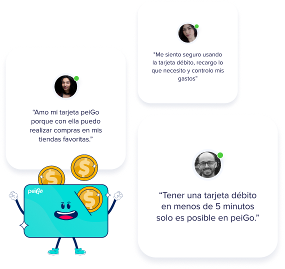 Obtén tu tarjeta de débito peiGo sin costo en minutos, sin comisiones ni tarifas ocultas. Elige el diseño que más te guste y úsala en Ecuador y el exterior.